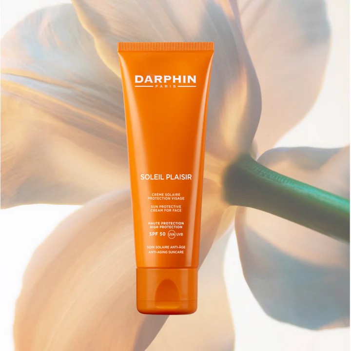 DARPHIN laboratorion taidonnäyte auringolta suojautumiseen. Uudistunut satiininpehmeä koostumus ja tekniset ja monikirjoiset SPF 50 UVA/ UVB- filtterit tarjoavat tehokkaan aurinkosuojan kasvoille, kaulalle sekä decolteelle.
