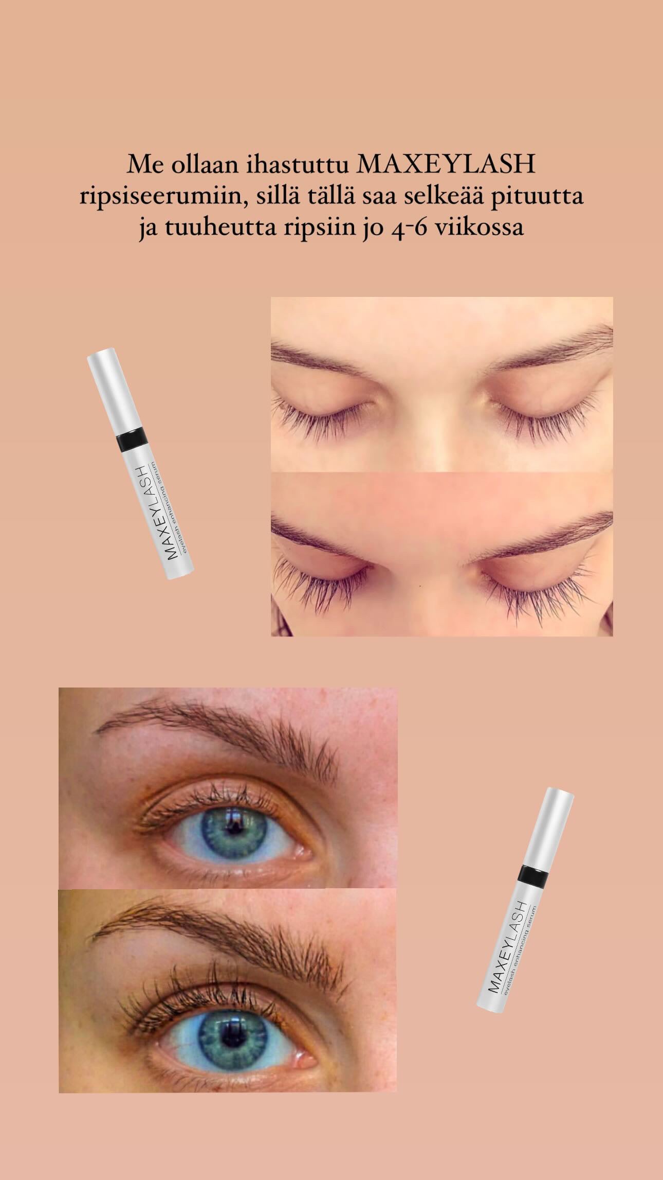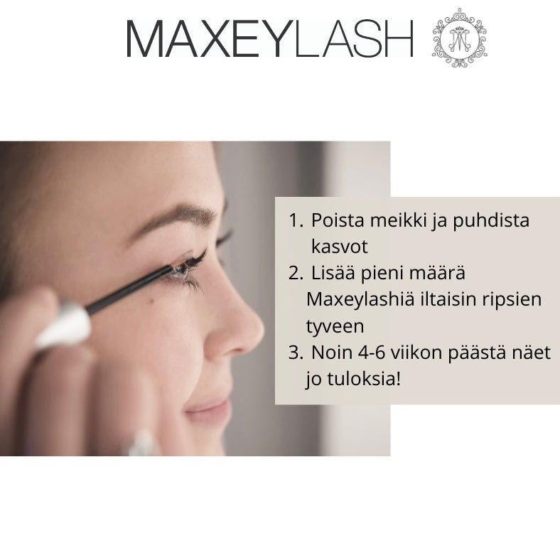MaxeyLash on hellävarainen silmäluomelle. Tuotteen laittamisen jälkeen iholla voi tuntua pientä kihelmöintiä ja kuumuutta, jotka häviävät nopeasti. Tämä on normaalia. Jos ripsirajan iho alkaa punoittamaan tai tuntuu aralta, käytetään joka toinen päivä kunnes ärsytys häviää. Jos tuotetta joutuu silmään, tulee silmät huuhdella välittömästi. Ei saa käyttää rikkoontuneelle iholle. Käyttö lopetettava, jos silmä punoittaa tai kutiaa. Jos oireet jatkuvat, ota yhteys lääkäriin.